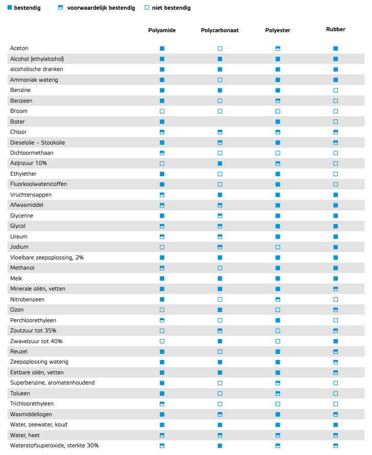 Deze lijst bevat de meest voorkomende chemicaliën. Het geeft informatie over de basisbestendigheid van onze productmaterialen in combinatie met chemicaliën. Er moet voornamelijk rekening worden gehouden met de concentratie van de chemicaliën en de omgevings- temperatuur. Als andere of gelijktijdig voorkomende chemicaliën worden gebruikt, moet een nauwkeurige controle van de bestendigheid worden uitgevoerd.